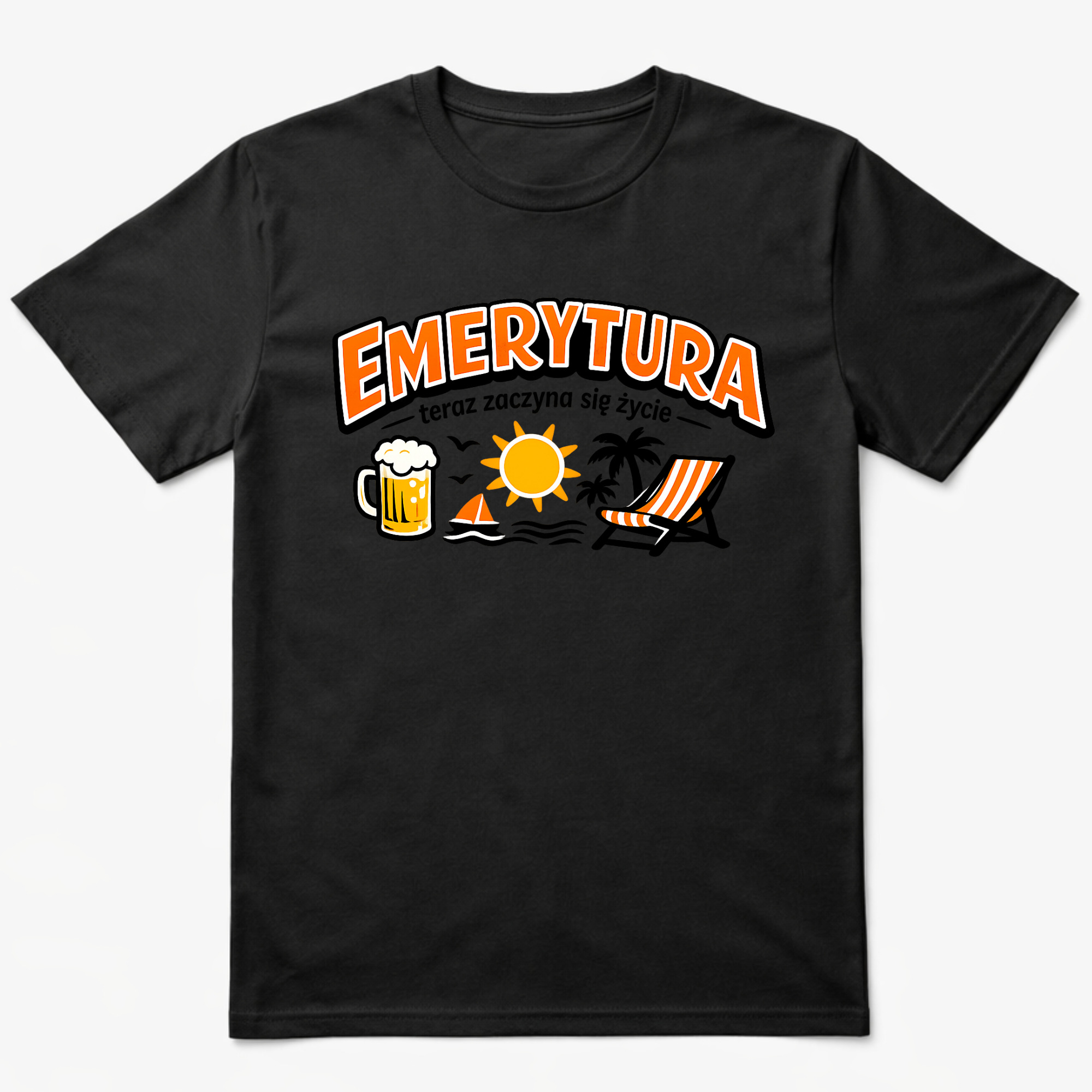 Koszulka z nadrukiem „Emerytura – teraz zaczyna się życie” to zabawna koszulka idealna dla osoby przechodzącej na emeryturę. Humorystyczna grafika z piwem, słońcem i leżakiem świetnie oddaje klimat odpoczynku i cieszenia się wolnym czasem po zakończeniu pracy.