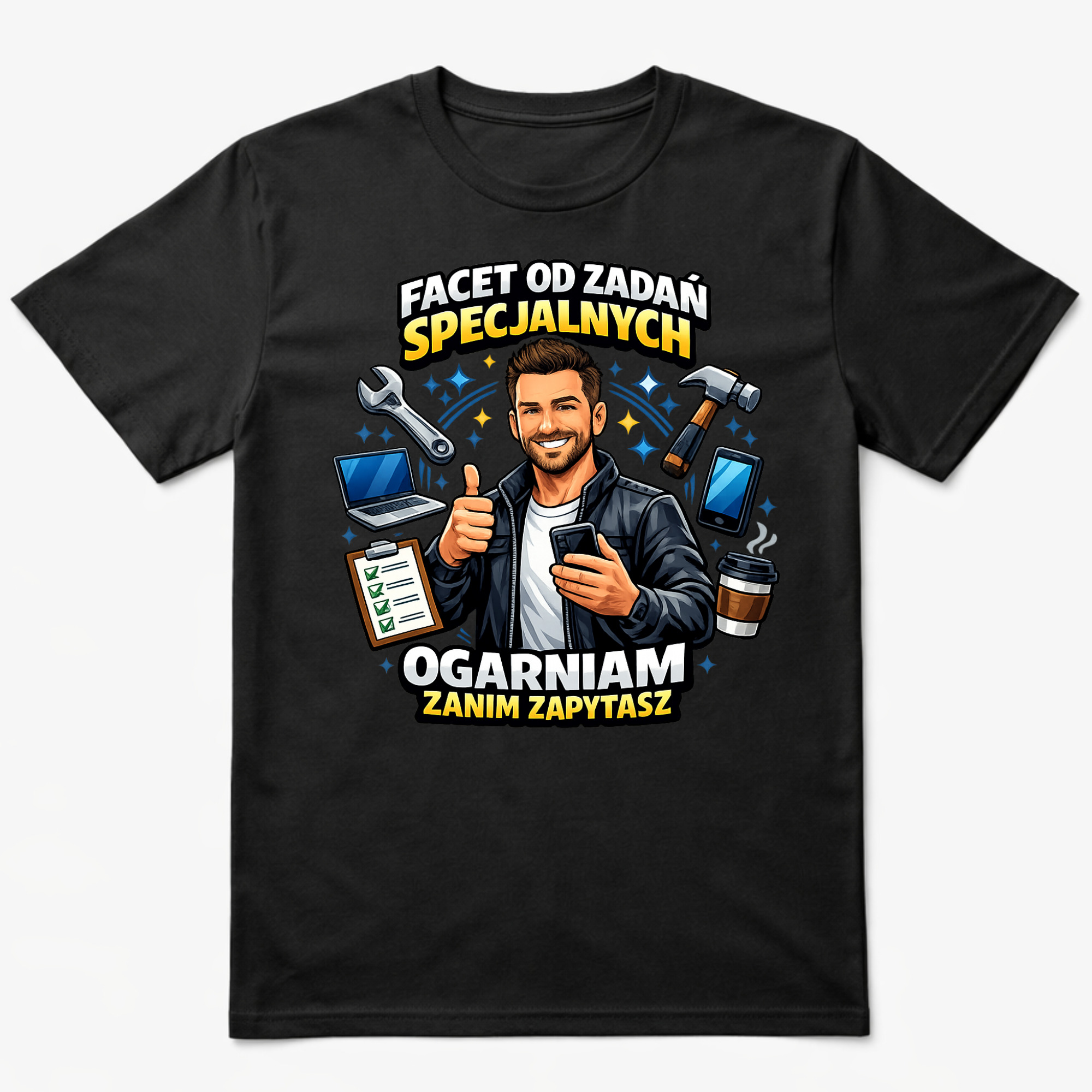 Koszulka z nadrukiem „Facet od zadań specjalnych – ogarniam zanim zapytasz” to zabawna koszulka dla mężczyzny, który zawsze potrafi wszystko naprawić i ogarnąć każdą sytuację. Kolorowa grafika z narzędziami i humorystycznym napisem sprawia, że koszulka świetnie nadaje się jako prezent dla faceta z poczuciem humoru.