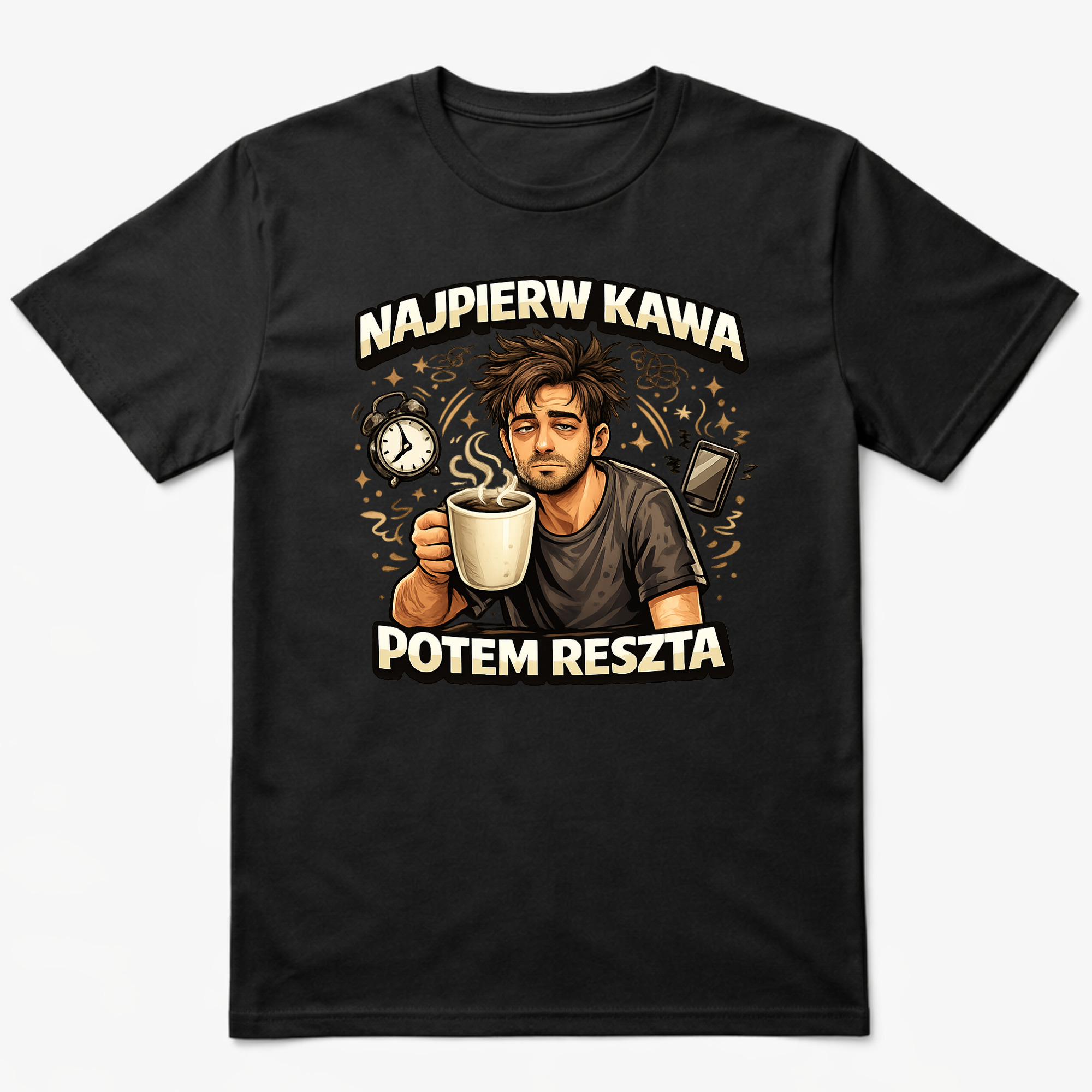 Koszulka z nadrukiem „Najpierw kawa, potem reszta” to zabawna koszulka dla osób, które nie wyobrażają sobie poranka bez filiżanki kawy. Humorystyczna grafika z kubkiem kawy i zmęczonym bohaterem idealnie oddaje poranny nastrój wielu kawoszy.